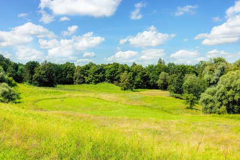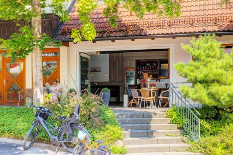 Много зеленых насаждений, теннисный корт, школа верховой езды, ягодное кафе весной/летом